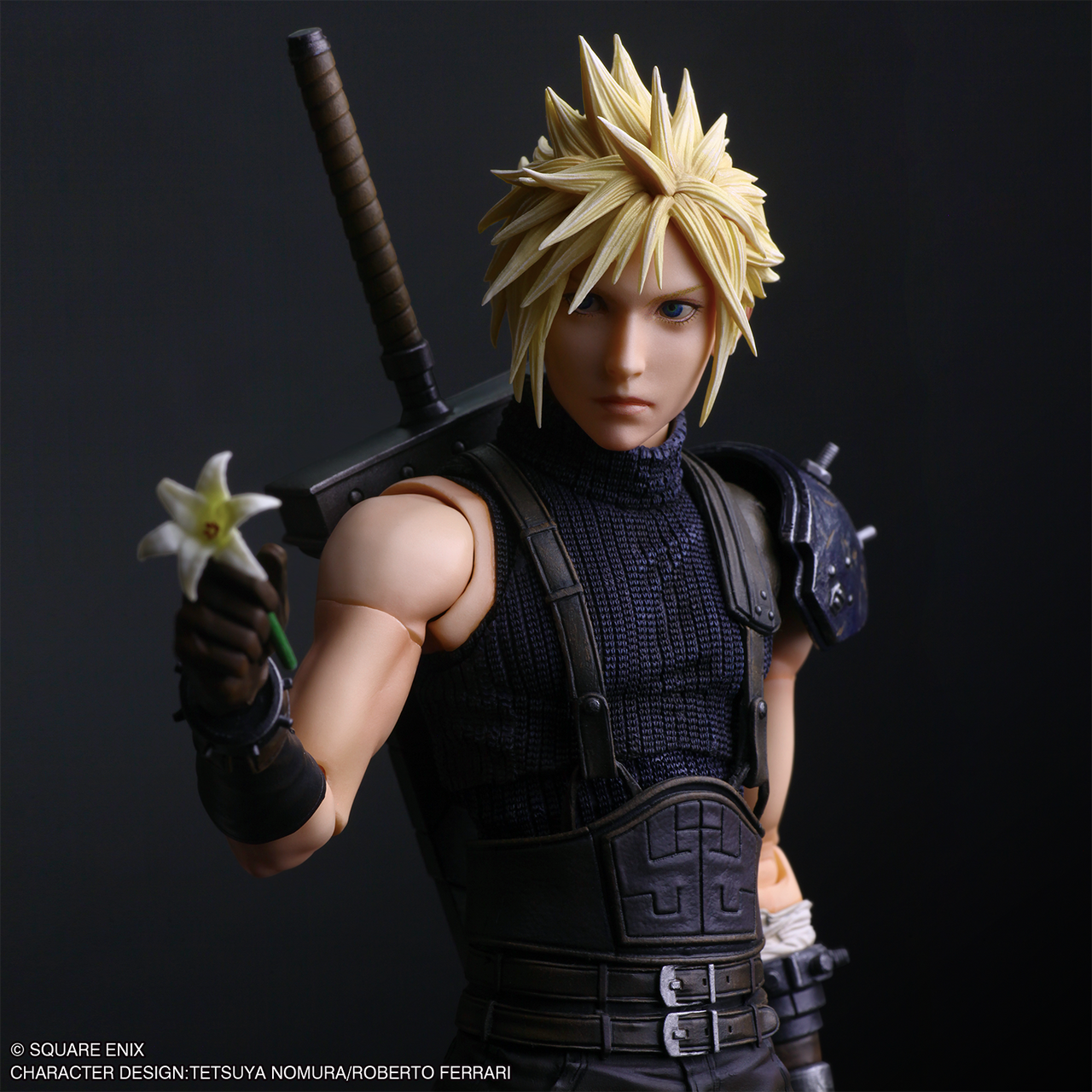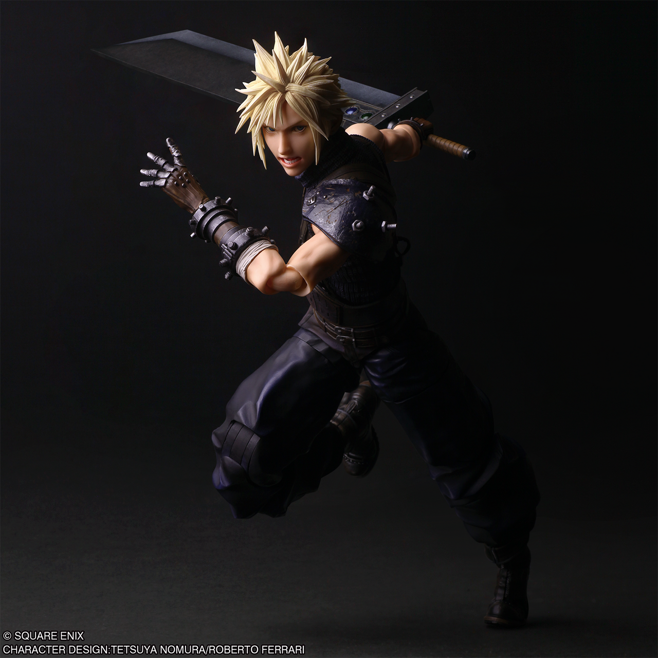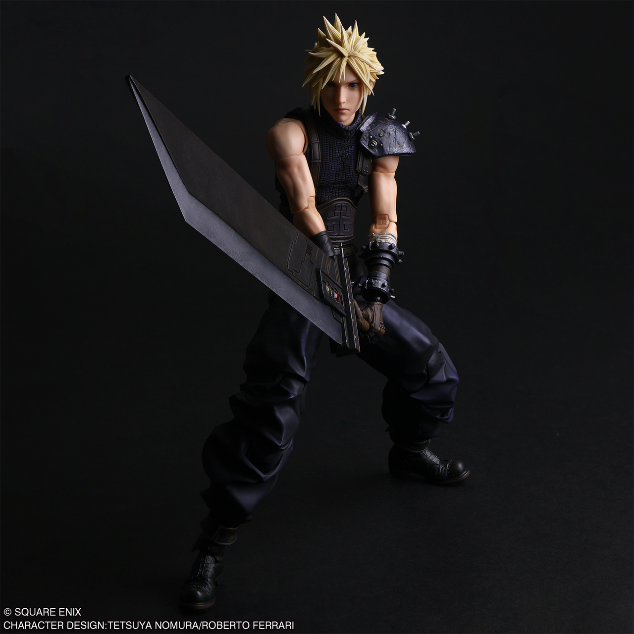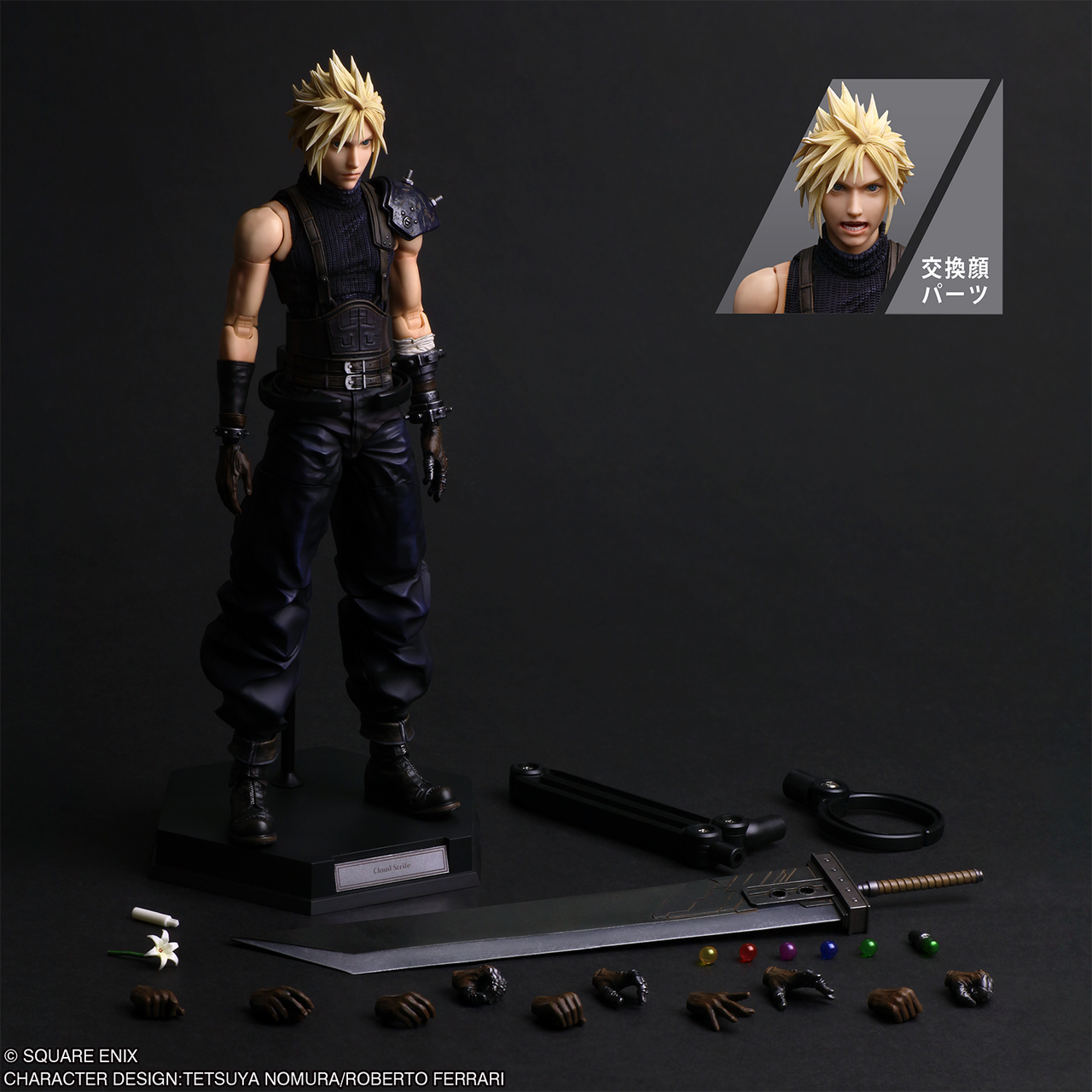 On retrouve également l'emblématique épée broyeuse de Cloud qui peut accueillir plusieurs matérias colorés. La figurine est aussi vendue avec plusieurs mains interchangeables pour encore plus de possibilités, comme une main tenant une fleur ou une matéria noire.